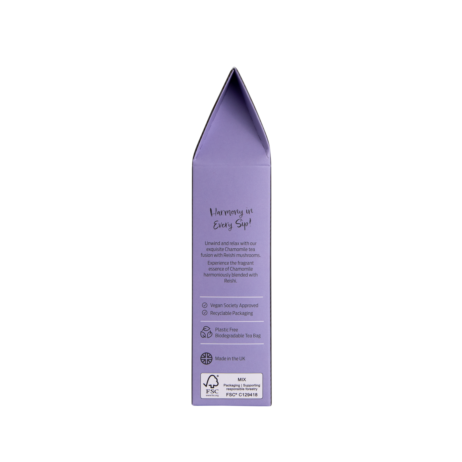 Each box contains 15 plastic-free pyramid teabags, containing premium Chamomile Flowers and Reishi mushroom pieces. The pyramid shape allows for maximum flavour infusion, bringing out the natural sweetness of Chamomile flowers, beautifully complemented by the gentle, earthy undertones of Reishi.