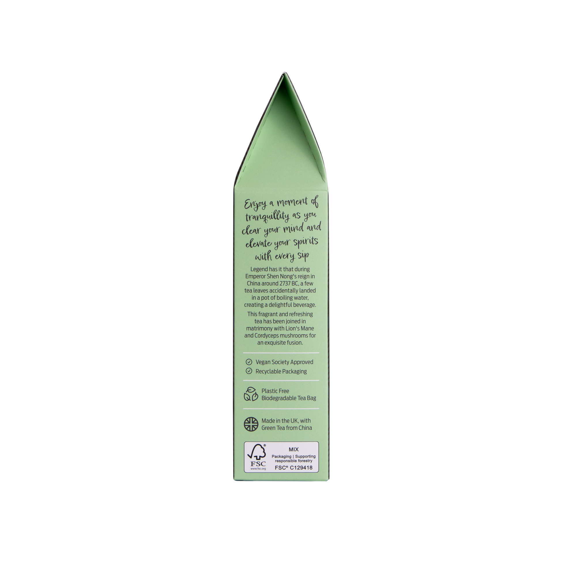 Each pyramid teabag is filled with premium green tea and real mushroom pieces. The pyramid shape allows for maximum flavour infusion, releasing the full character of the tea and mushroom ingredients.